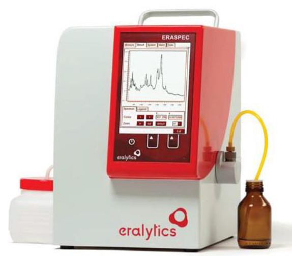 ИК-Фурье спектрометр ERASPEC компании Eralytics (Австрия) с 6,5" 4 цветным сенсорным экраном и интегрированным 16 μм металлическим фильтром, работающий в спектральном диапазоне 630–4000 см–1. Предназначен для определения массовой и объемной концентрации метиловых (этиловых) эфиров жирных кислот в биодизельном топливе, а также состав нефтяного дизельного топлива и цетановое число. Анализ и обработка данных занимает всего 60 секунд.