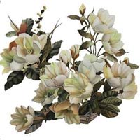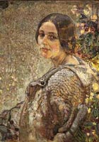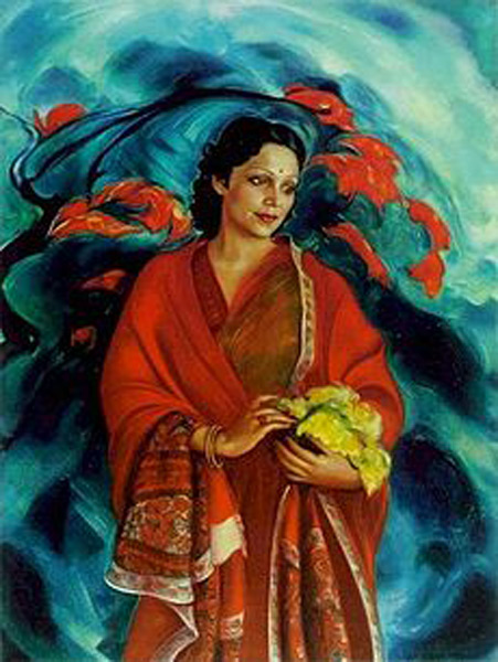Девика Рани не только стала соратницей своего мужа в изучении индийской культуры и фольклора, она - этот "магический цветок романтики", как назвала Девику индийская поэтесса Сароджини Найду, - была его музой. Художник создал многочисленные картина-портреты своей знаменитой супруги, полные одухотворения и любви. Их долгий и счастливый брак стал "мостом" между двумя культурами - индийской и русской. Святослав Николаевич создает чудесный портрет Девики Рани Рерих. Очаровательна одухотворенная и женственная ее красота. В руках у нее крупные желтые цветы жасмина. В едва склоненном лице выражена легкая задумчивая мечтательность. Художник передает пластичность складок накинутой сверху ткани интенсивного, но спокойного малиново - красного оттенка. Над головой изогнулась цветущая ветвь кораллового дерева. Облик Девики Рани необычайно лиричен.