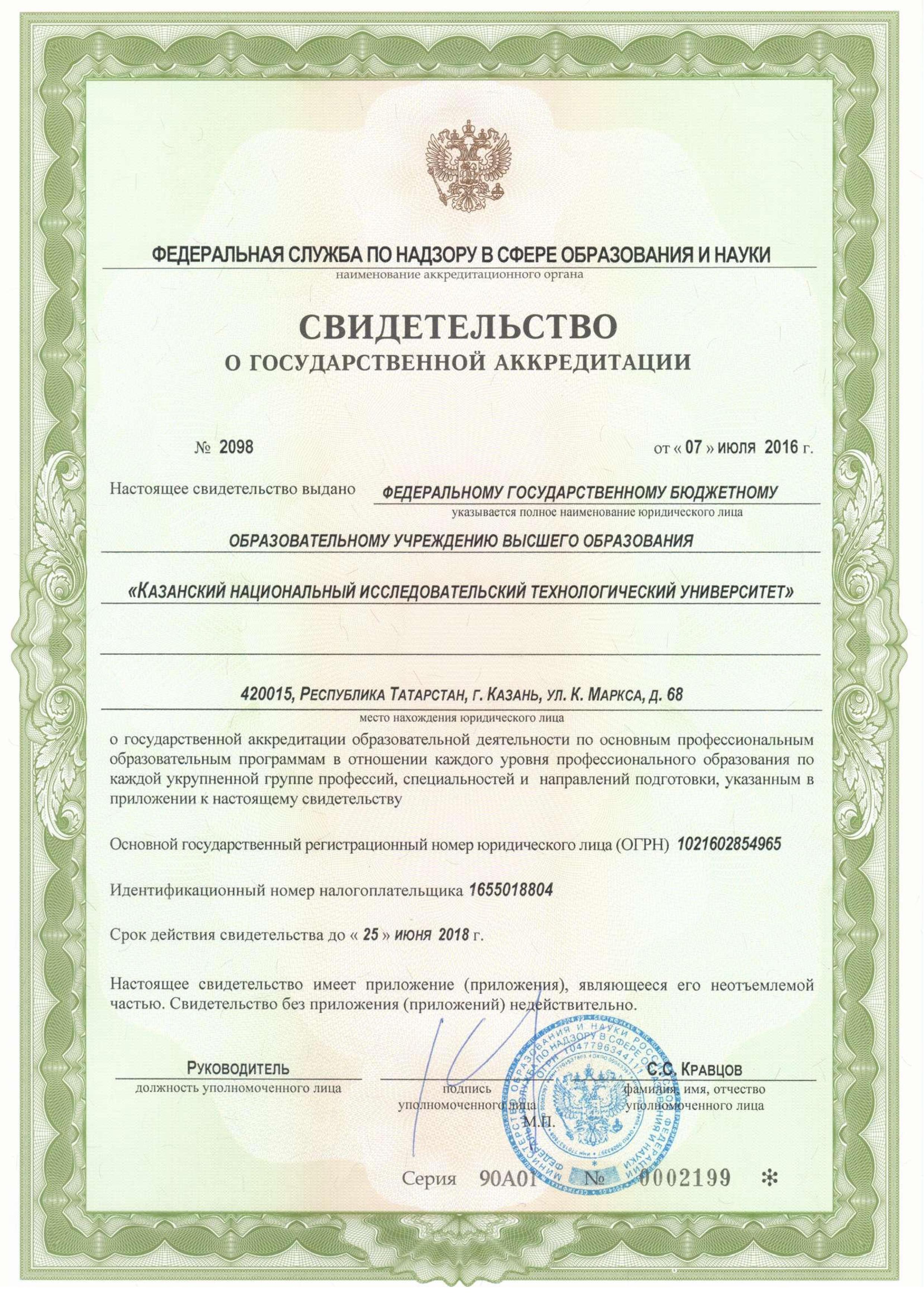 Свидетельство об аккредитации КНИТУ от 25 июня 2012 г. серия 90А01 № 0000002