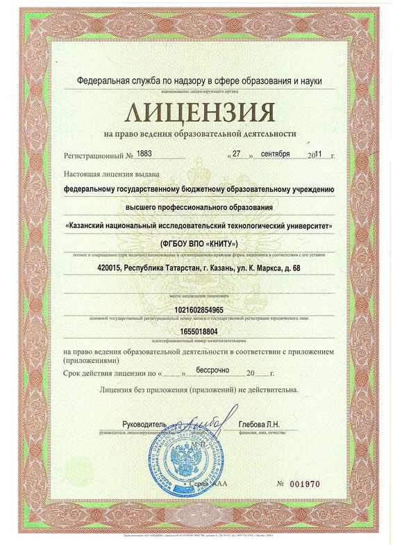 Лицензия КНИТУ от 27 сентября 2011 г. серия ААА № 001970 с приложением