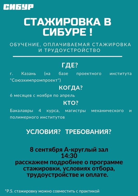 Требования к кандидатам: граждане мужского пола в возрасте до 27 лет граждане, имеющие категорию годности к военной службе по состоянию здоровья – не ниже Б-4 обучающиеся со средним баллом успеваемости не ниже 4,0 С перечнем специальностей, подходящих для отбора, можно ознакомиться по ссылке 8 сентября в 14:30 в А-круглом зале состоится встреча с представителем ООО «СИБУР ЦСПО». Приглашаются студенты (4 курс бакалавры, 1-2 курс магистры) для отбора на стажировку. Стажировка будет проходить на базе ПИ «Союзхимпромпроект», оплачиваемая. Приглашаются обучающиеся механического института и института полимеров.
