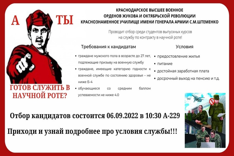 6 сентября в 10:30 в А-229 состоится встреча с представителем Краснодарского высшего военного училища, где будет проведен отбор среди студентов, желающих пойти на службу по контракту в научной роте.