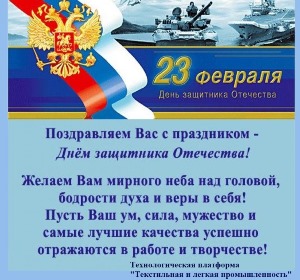 Дайджест центральных сми от 15.02.2019 г. Технологическая платформа «Текстильная и легкая промышленность» информирует, что 24-26 апреля 2019 года в рамках региональной программы Всероссийского фестиваля науки Ивановский государственный политехнический университет проводит ежегодную Всероссийскую (с международным участием) молодежную научно-техническую конференцию «Молодые ученые – развитию Национальной технологической инициативы» («ПОИСК - 2019»). Приглашаем Вас принять участие во Всероссийской молодёжной научно-технической конференции. Поздравления
