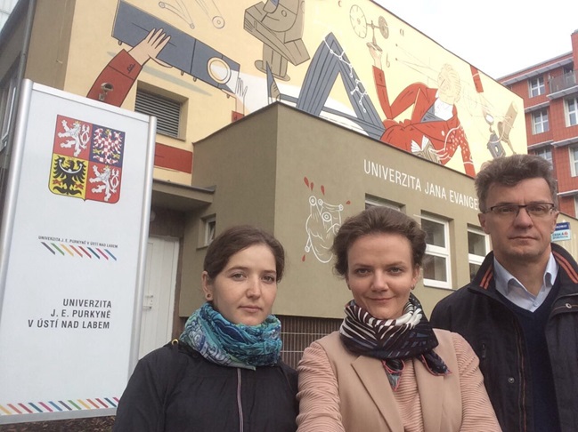 Аспирант Сибиева Л.М., доцент Вдовина Т.В. и заведующий кафедрой Сироткин А.С. в университете Яна Евангелиста Пуркине, г. Усти над Лабем, Чехия, сентябрь 2017 года (в составе проектной группы по гранту Правительства РТ и программе Минобрнауки РТ «Алгарыш»)