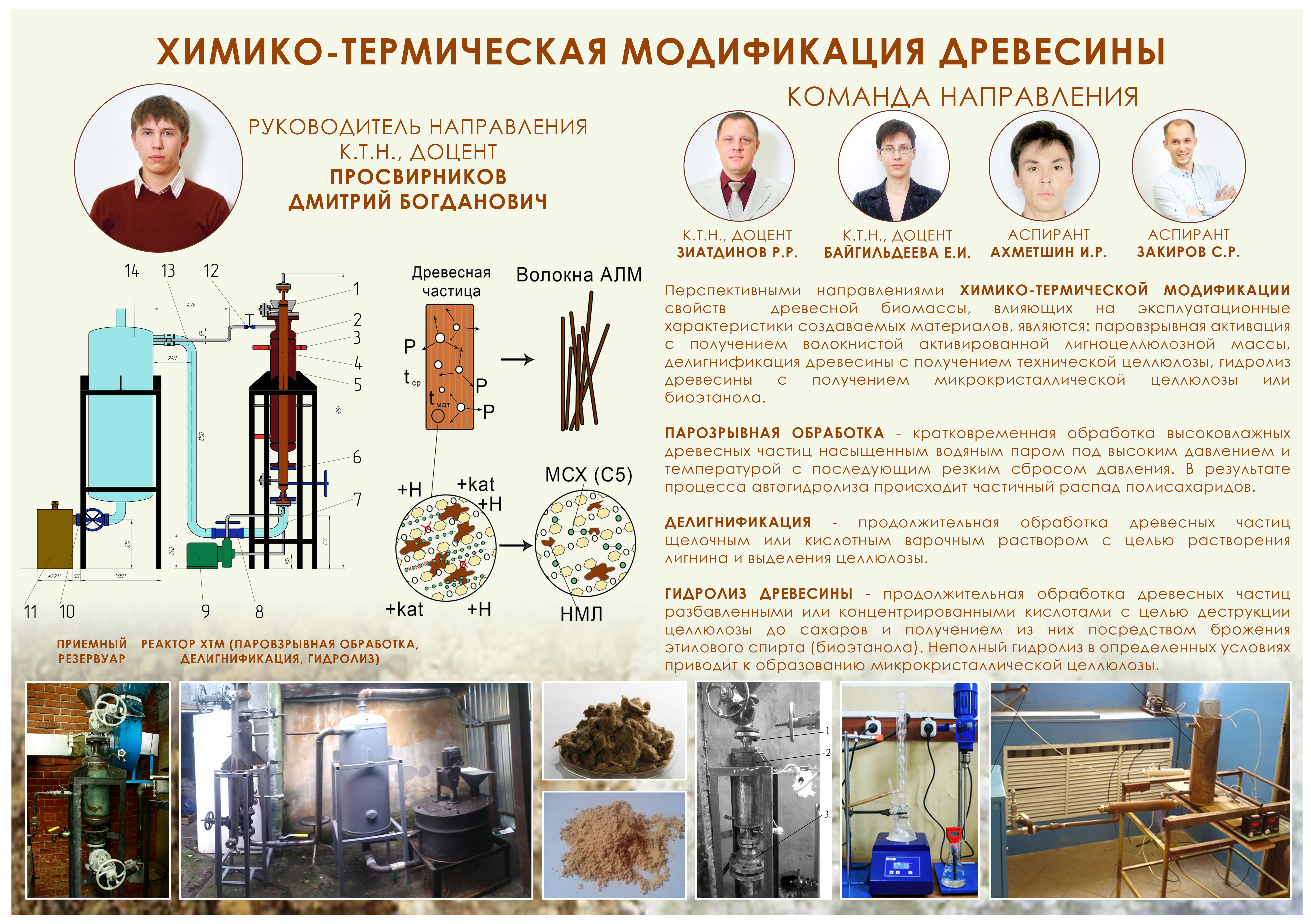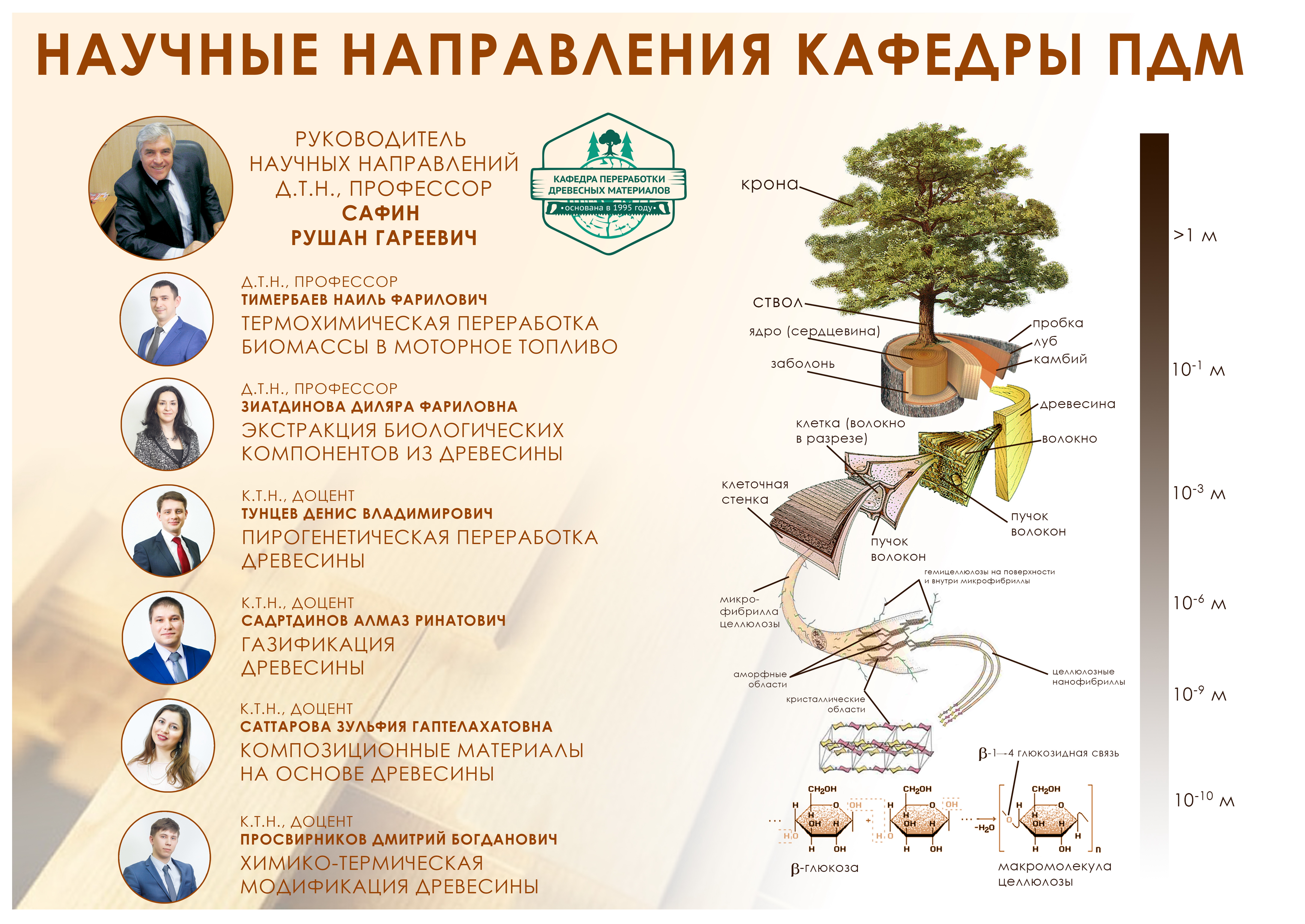 Историческая справкаКафедра «Переработка древесных материалов» создана решением Ученого совета Казанского государственного технологического университета (КГТУ) от 25 декабря 1995 года. Деревоперерабатывающие предприятия и организации Казани, Республики Татарстан, Марий Эл, Башкортостана и других регионов России определили спрос на подготовку специалистов в области деревообработки и являются потребителями высококвалифицированных кадров, выпускаемых кафедрой. Полученные знания помогают выпускникам кафедры строить свою карьеру в качестве руководителей собственных предприятий, ведущих специалистов-дизайнеров, технологов и конструкторов в различных областях деревопереработки, в частности, на предприятиях по производству мебели, древесностружечных и древесноволокнистых плит, фанеры, дверей, оконных блоков, деревянных домов и т.д. На кафедре переработки древесных материалов студенты получают возможность приобрести глубокие комплексные знания по перспективному и востребованному профилю подготовки специалистов в области дизайна и автоматизированного проектирования изделий из древесины. В процессе обучения студенты приобретают знания об основах организации и управления деревообрабатывающим комплексом, о строении и свойствах древесины, современном состоянии техники и технологии переработки древесных материалов с целью получения продукции, применяемой в деревянном домостроении, ремонте, отделке помещений и производстве мебели.