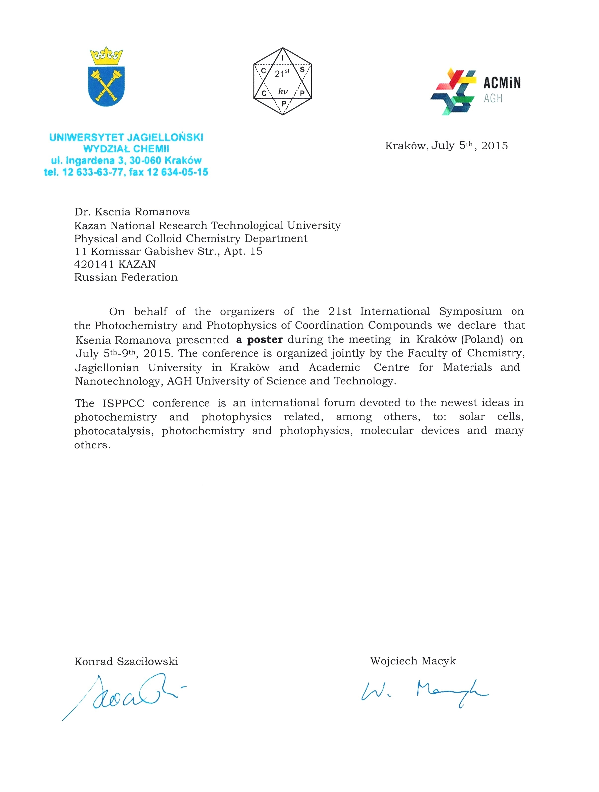 Романова К.А., Стрелков М.В., Галяметдинов Ю.Г. , Определение квантового выхода люминесценции некоторых комплексов европия по данным квантово-химических расчетов / Вестник технологического университета. 2012, т.15, в.2, с.10-12 (ISI)
