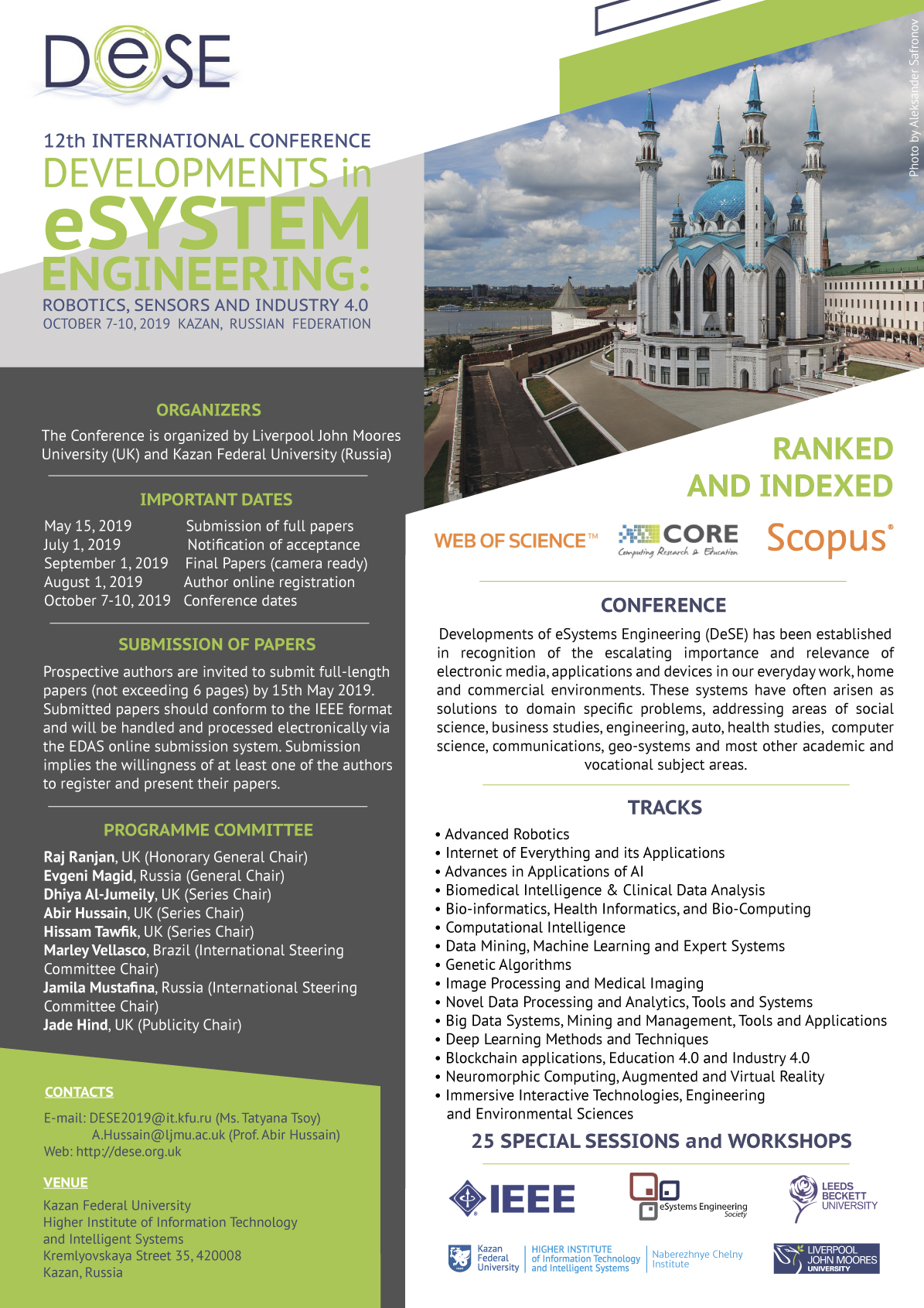05.04.2019 12-я Международная конференция "Эволюция инжиниринга электронных систем" (Developments in e-Systems engineering”, DeSE2019) пройдет в г. Казань, Россия, с 7 по 10 октября.
