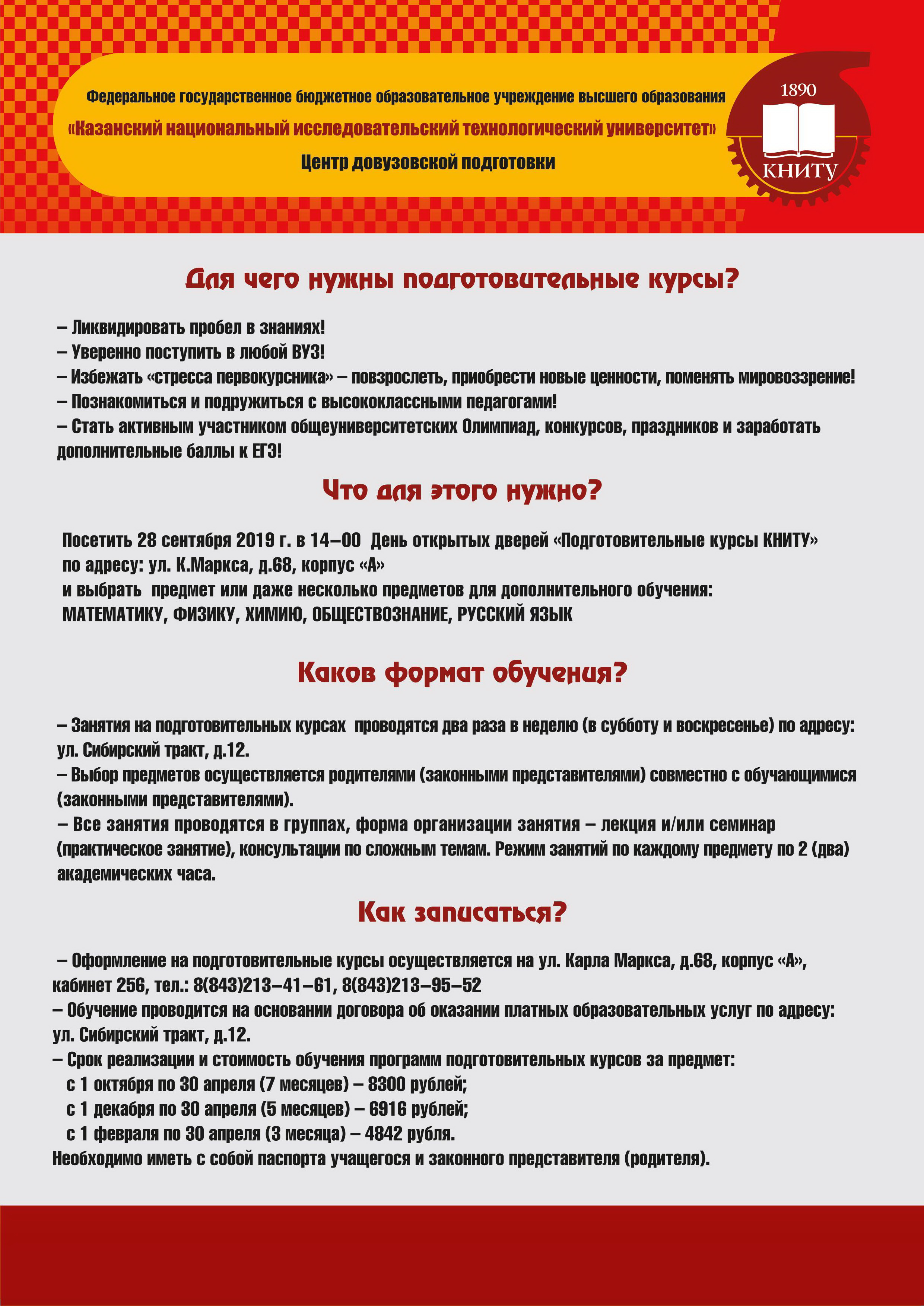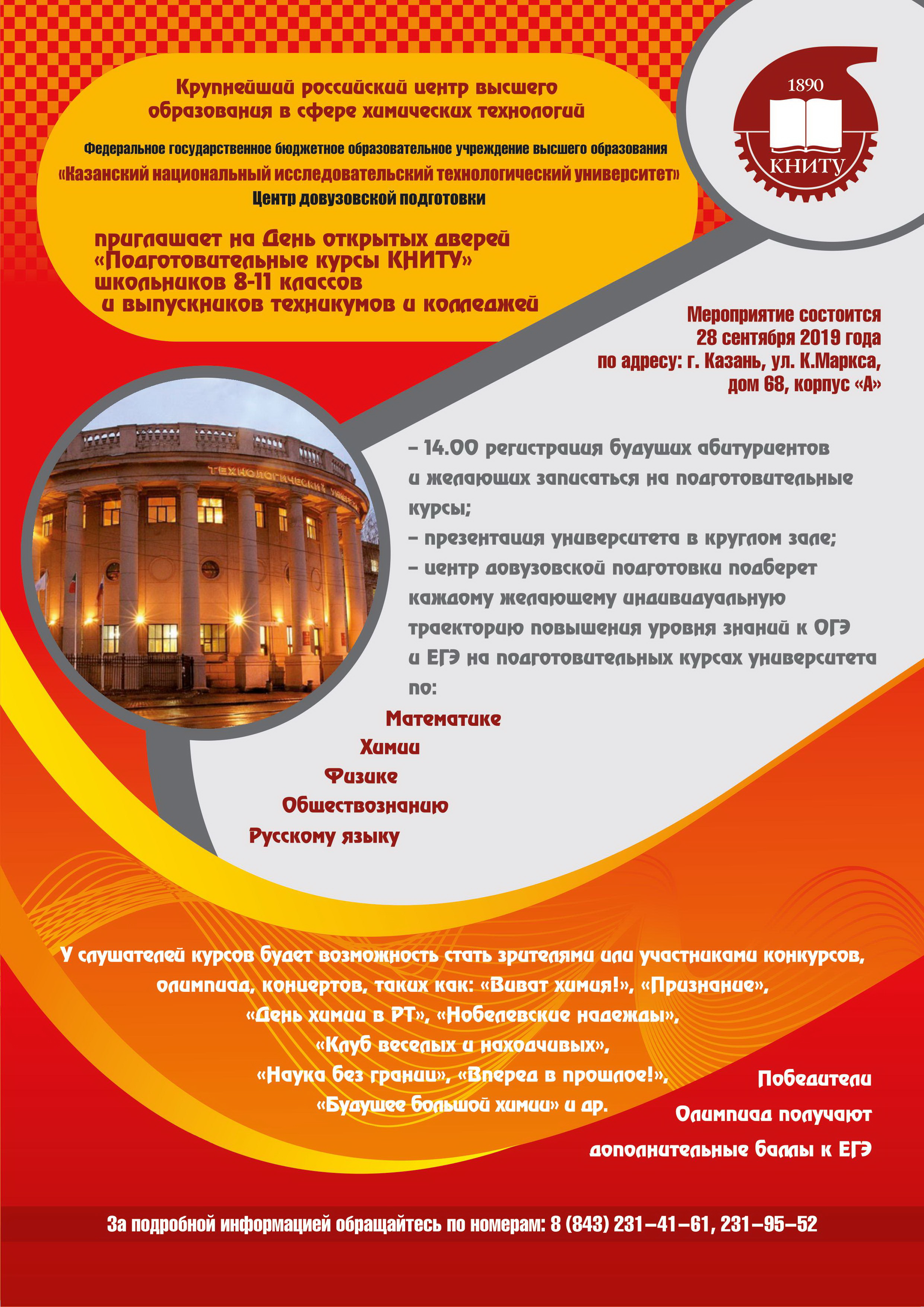 28 сентября в 14:00 в КНИТУ состоится День открытых дверей. На встрече вы узнаете о программах и формах обучения, особенностях учебного процесса и способах поступления. Будут организованы индивидуальные консультации, на которых опытные преподаватели помогут каждому подобрать удобные траектории подготовки на будущий учебный год.