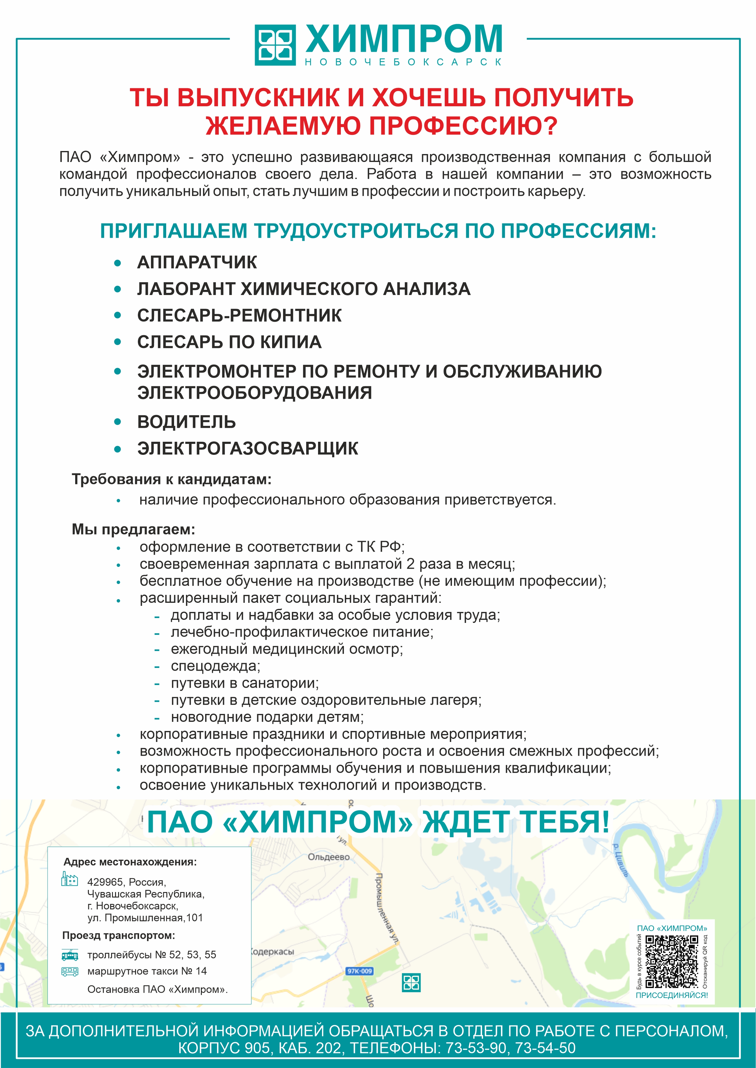 ПАО «Химпром» г. Новочебоксарск приглашает студентов и выпускников трудоустроиться по различным профессиям.