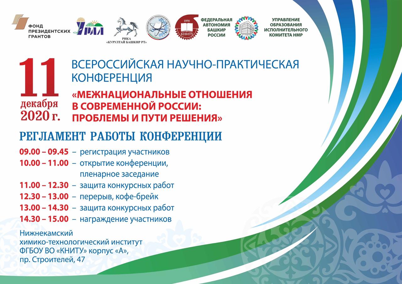02.12.2020 Приглашаем Вас принять участие во Всероссийской научно-практической конференции «Межнациональные отношения в современной России: проблемы и пути решения». Конференция проводится в рамках социального проекта «Дружи! Мечтай! Твори!» с использованием гранта Президента Российской Федерации на развитие гражданского общества. Конференция приурочена к Всероссийской неделе патриотического воспитания. Цель конференции - активизация творческой, исследовательской инициативы молодежи через привлечение их к интеллектуальной, проектной деятельности в области науки и культуры, направленной на сохранение и развитие этнокультурного многообразия, укрепление межнациональных отношений и единства российской нации. Организаторами конференции являются: 1. Нижнекамский химико-технологический институт (филиал) федерального государственного бюджетного образовательного учреждения высшего образования «Казанский национальный исследовательский технологический университет». 2. Региональная общественная организация «Национально-культурная автономия башкир - Курултай (конгресс) башкир Республики Татарстан». 3. Федеральное государственное бюджетное образовательное учреждение высшего образования «Казанский национальный исследовательский технологический университет». 4. Общественная организация «Федеральная национально-культурная автономия башкир России». 5. Государственное бюджетное учреждение «Дом Дружбы народов Татарстана». 6. Управление образования Исполнительного комитета Нижнекамского муниципального района. Конференция проводится в очно-заочной форме. Для участия в Конференции участники в срок не позднее 07 декабря 2020 года направляют в адрес оргкомитета на e-mail: VR-nchti@yandex.ru полный пакет документов. Заключительный этап состоится 11 декабря 2020 года в Нижнекамском химико-технологическом институте ФГБОУ ВО «КНИТУ» (Республика Татарстан, город Нижнекамск, пр. Строителей, 47). Все участники Конференции награждаются сертификатами участника, победители и призеры – дипломами и призами. Участие в конференции БЕСПЛАТНОЕ. Условия участия и положение конференции Вы можете узнать на сайте НХТИ. По итогам Конференции выпускается в электронном виде и публикуется сборник трудов на сайте www.nchti.ru. Контактные данные: Габдушева Эльвира Наильевна - начальник управления по воспитательной работе и молодежной политике НХТИ ФГБОУ ВО «КНИТУ» – 89172909736; Багаутдинова Динара Фанисовна - специалист по воспитательной работе воспитательного отдела НХТИ ФГБОУ ВО «КНИТУ» – 89172270718.