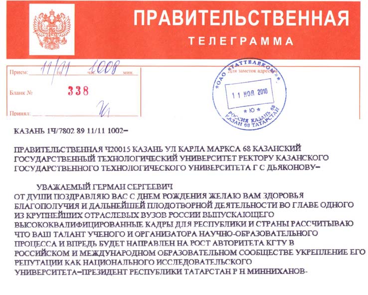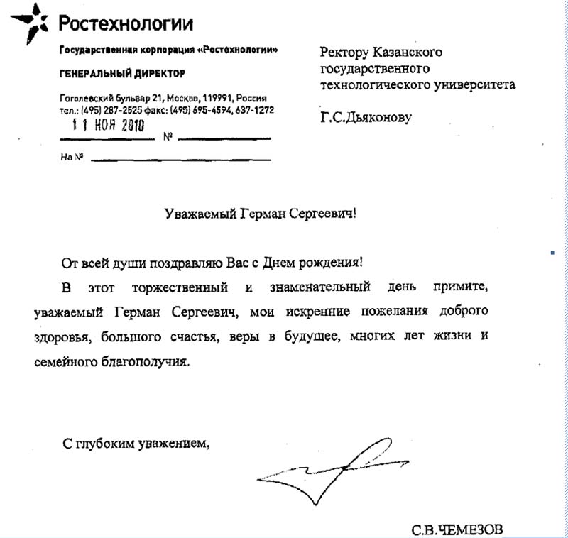 11.11.2010 Поздравления прислали президент Республики Татарстан Р.Н.Минниханов и генеральный директор госкорпорации "Ростехнологии" С.В. Чемезов Приложение: