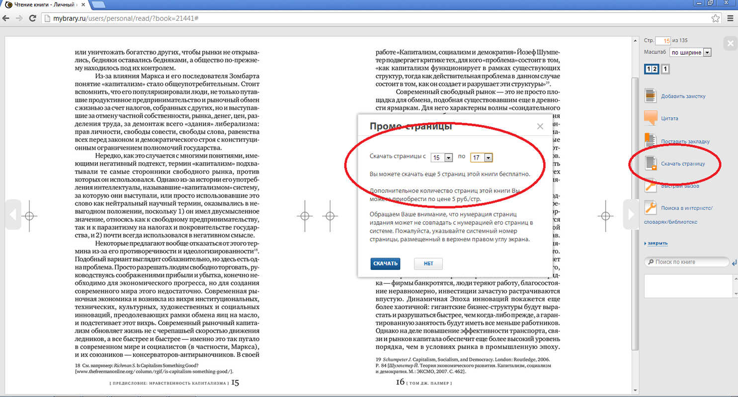 - любое количество страниц книг всех издательств (кроме одного) можно купить и скачать по той же цене, что отксерокопировать в "обычной" (неэлектронной) библиотеке (5 руб./стр.). Мы уверены, что это очень полезная для пользователей функция, хоть и платная: она дает возможность использовать файл любым образом после покупки, в т.ч. делиться с друзьями, использовать в работе и т.п., а копии страниц навсегда сохранятся в личном кабинете, их можно будет скачать неоднократно, в любой момент. Кроме того, согласитесь, мало где можно сделать и унести с собой копии страниц бесплатно. Мы отчитываемся за все покупки перед издательствами и перечисляем вознаграждение за каждую скачанную страницу.