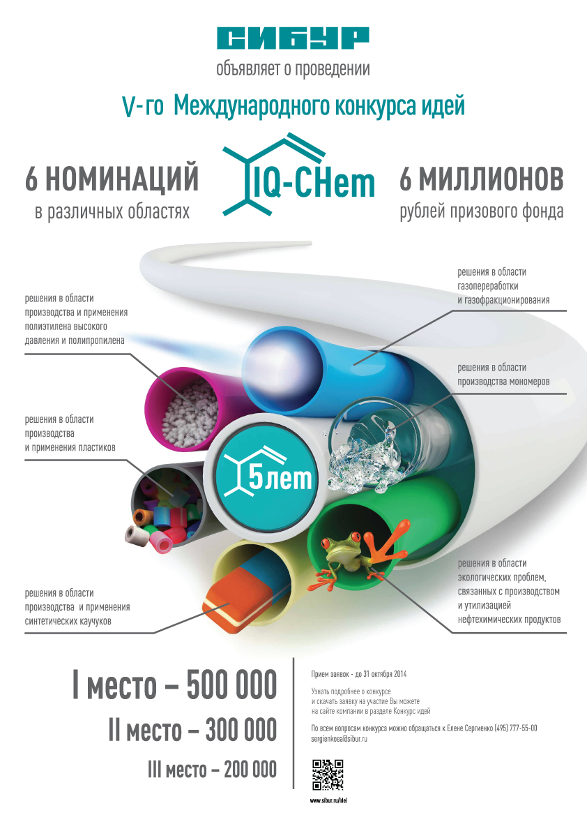 15.09.2014 СИБУР объявляет о проведении юбилейного “V-го Международного конкурса идей “IQ-CHem” по инновационным решениям в области производства и применения нефтехимических продуктов. Перечень номинаций “V-го конкурса идей “IQ-CHem” включает в себя: