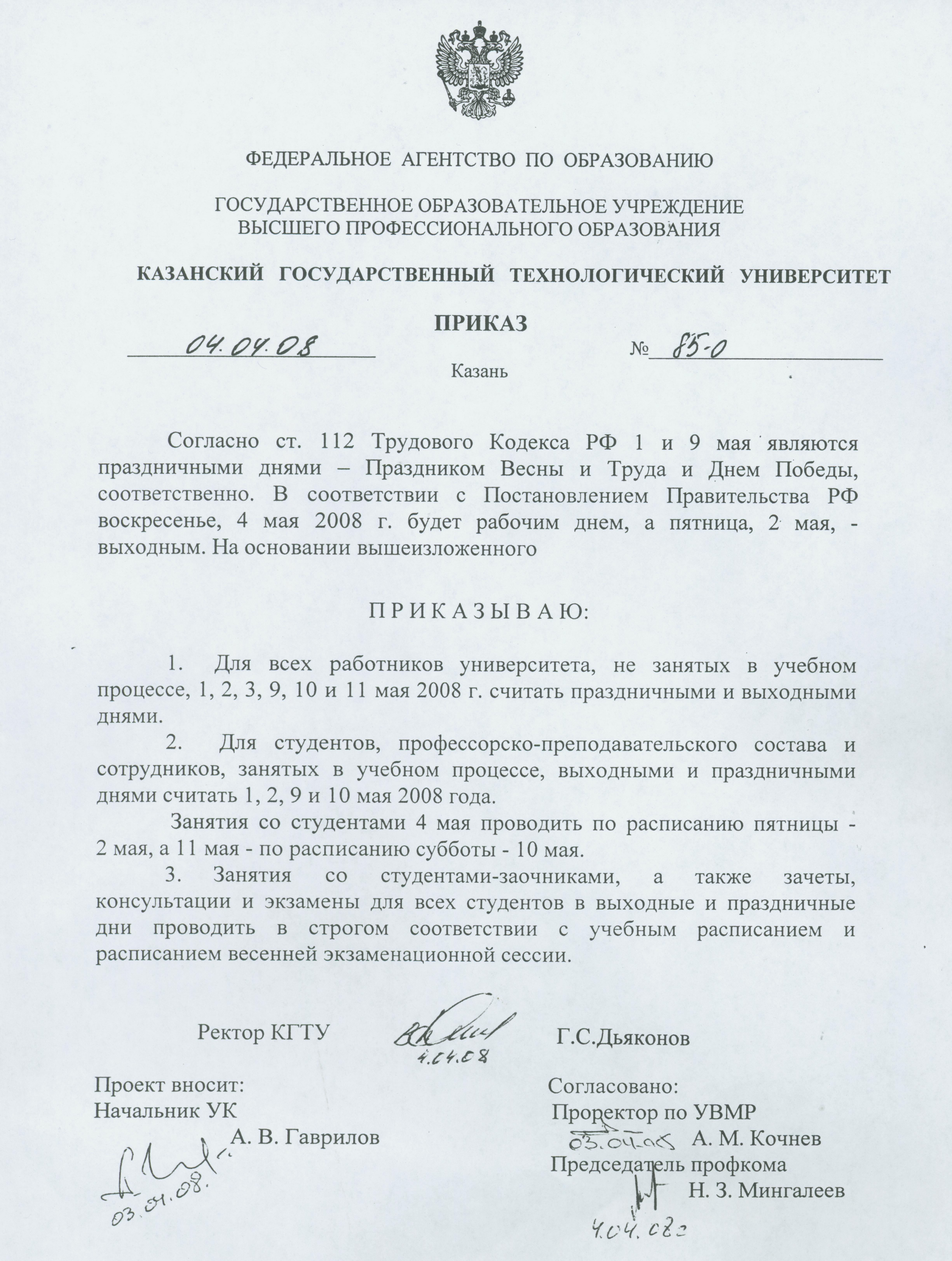 Внимание! Вышел приказ №85-О от 04.04.08г. "О праздничных и выходных днях в КГТУ".