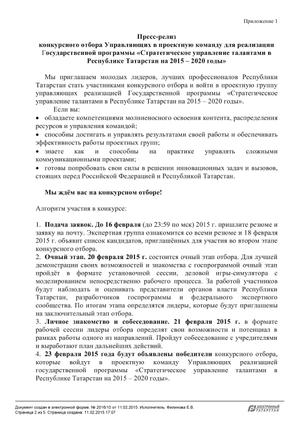 13.02.2015 Подача заявок. До 16 февраля 2015 года Молодые лидеры, лучшие профессионалы Республики Татарстан приглашаются для участия в конкурсном отборе для работы в проектной группе управляющих реализацией Государственной программы «Стратегическое управление талантами в Республике Татарстан на 2015 – 2020 годы». Участник должен обладать компетенциями быстрого освоения контента, распределения ресурсов и управления командой, достигать и управлять результатами своей работы и обеспечивать эффективность работы проектных групп, знать как в теории и на практике управлять сложными коммуникационными проектами и т.п. Алгоритм участия в конкурсе: