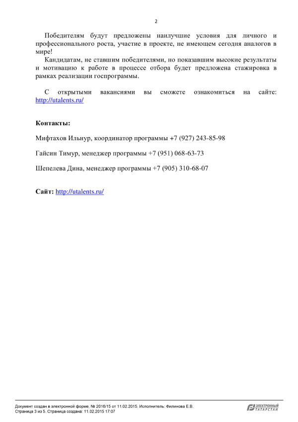 Победителям будут предложены наилучшие условия для личного и профессионального роста, участие в проекте, не имеющем сегодня аналогов в мире! Кандидатам, не ставшим победителями, но показавшим высокие результаты и мотивацию к работе в процессе отбора будет предложена стажировка в рамках реализации госпрограммы. С открытыми вакансиями вы сможете ознакомиться на сайте: utalents.ru Приложение: Пресс-релиз 1 страница, 246.0 КБ Пресс-релиз 2 страница, 99.3 КБ