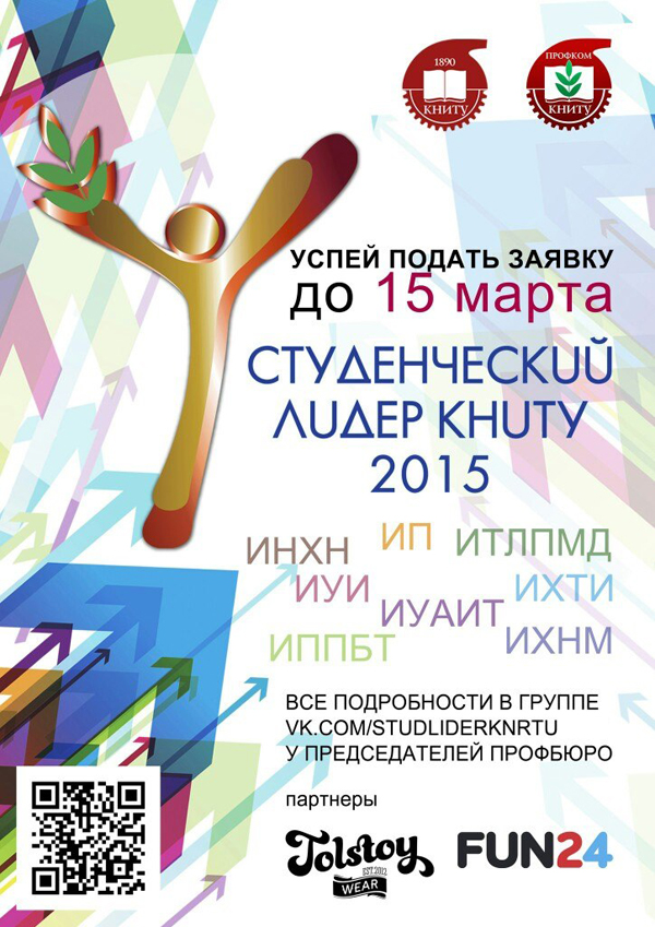 Студенческая секция профкома КНИТУ проводит ежегодный конкурс "Студенческий лидер КНИТУ 2015"! С 18 марта пройдут отборочные этапы Конкурса на институтах, а в апреле - финал, где будут принимать участие победители отборочных этапов.