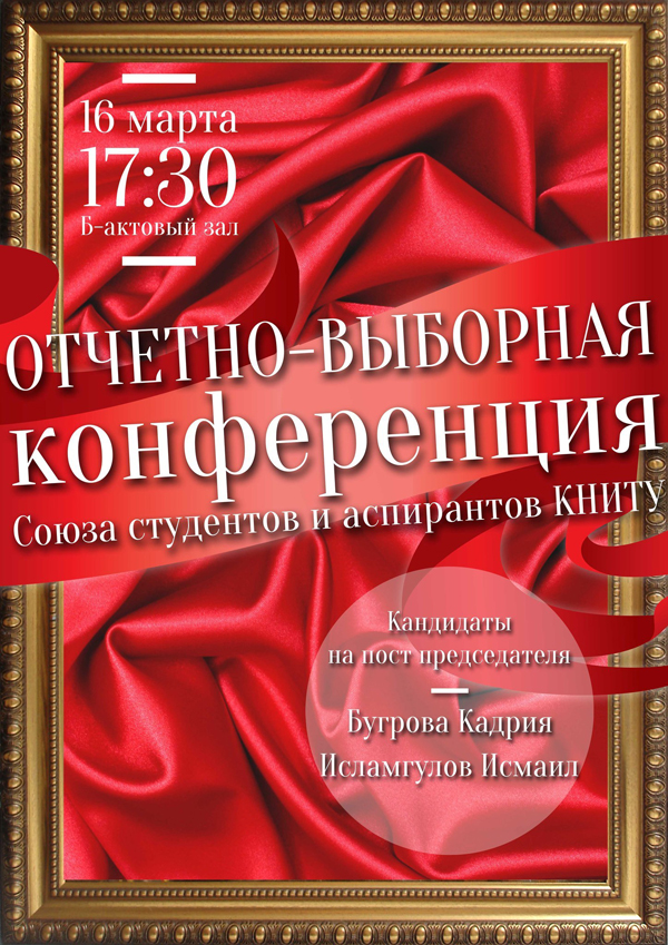 12.03.2015 16 марта 2015 года в 17.30 В рамках конференции состоятся выборы нового председателя ССА КНИТУ, а также будут определены делегаты на очередной Конгресс студентов Республики Татарстан