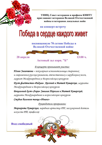 Приглашаем всех желающих на концерт-встречу с ветеранами ВОВ и ветеранами локальных войн «Победа в сердце каждого живет», посвященную 70-летию Победы,