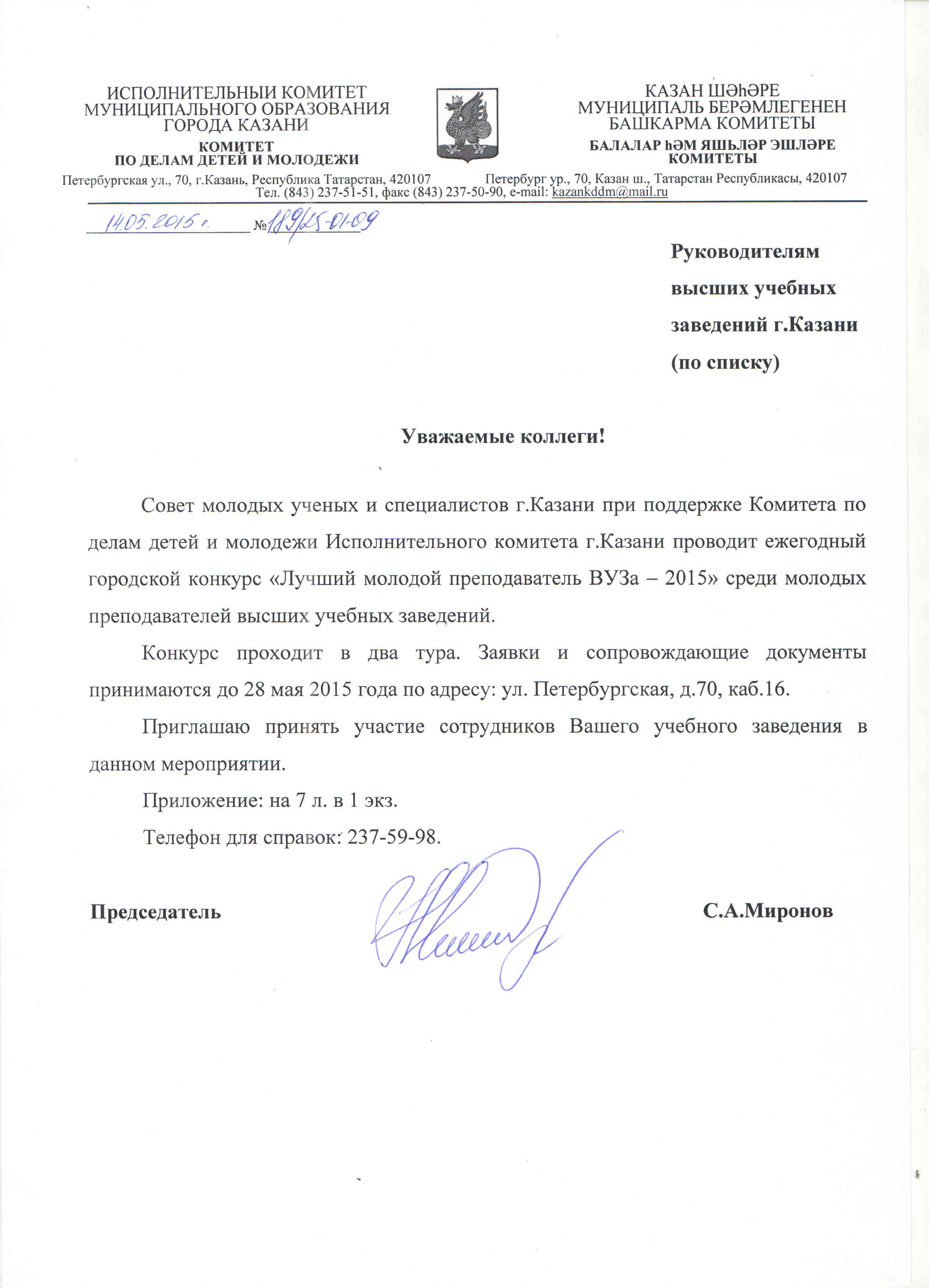 ПОЛОЖЕНИЕ конкурса «Лучший молодой преподаватель ВУЗа -2015» Письмо Председателя Комитета по делам детей и молодежи исполнительного комитета г. Казани Миронова С.А.