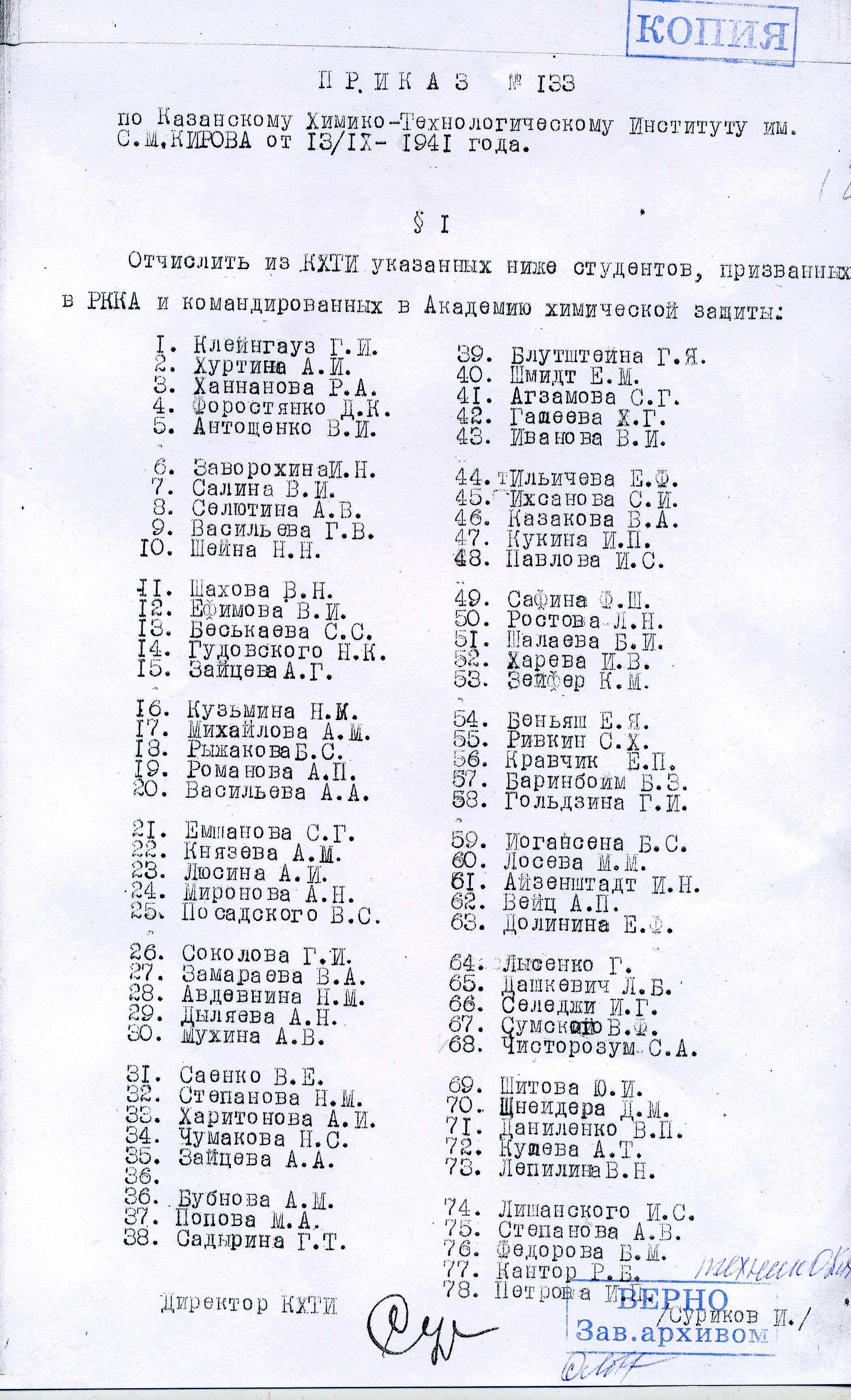 13.11.2015 По Указу Президента РФ № 549 от 31 мая 2006 года «Об установлении профессиональных праздников и памятных дней в Вооруженных силах РФ» 13 ноября в нашей стране отмечается памятный день — День войск радиационной, химической и биологической защиты (РХБЗ). Для КНИТУ это не только знаменательная дата, но и день памяти о подвиге 78 студентов 3-4 курсов оборонного факультета, ушедших добровольцами на фронты Великой Отечественной войны (1941-1945). Путь в действующую армию для каждого из них лежал через Академию химической защиты имени М.В. Фрунзе, эвакуированную в те суровые годы в далекий и безопасный Ташкент. На фронт выпускники Академии попадали сержантами (ускоренный выпуск) и лейтенантами войск химической защиты. За свой ежедневный боевой подвиг – мужество и героизм, проявленные в уничтожении живой силы и техники противника огнеметно-зажигательными средствами, наши студенты-фронтовики были награждены орденами и медалями. Среди этих наград – ордена «За отвагу» и «Отечественной войны 1 и 2 степени», дававшиеся за стойкость и отвагу, способствовавшие успеху боевых операций наших войск, медали за защиту особо важных стратегических пунктов: «За оборону Москвы» и «За оборону Сталинграда». В честь празднования Дня войск РБХЗ, 13 ноября 2015 года, в Музее Трудовой Славы Инженерного химико-технологического института (ИХТИ) прошла лекция-презентация под названием: «Участники Великой Отечественной войны ИХТИ КНИТУ» по материалам, собранным студентами ИХТИ к 70-летию Великой Победы. Приложение: Приказ по КХТИ по командированию студентов в академию химзащиты от 13.09.1941, 1.98 МБ