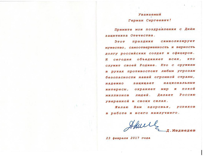 Поздравление Председателя Правительства Российской Федерации Дмитрия Анатольевича Медведева с Днем защитника Отечества
