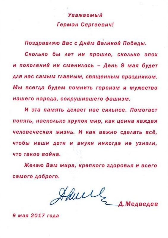 Поздравление Председателя Правительства Российской Федерации Дмитрия Анатольевича Медведева с Днём Победы