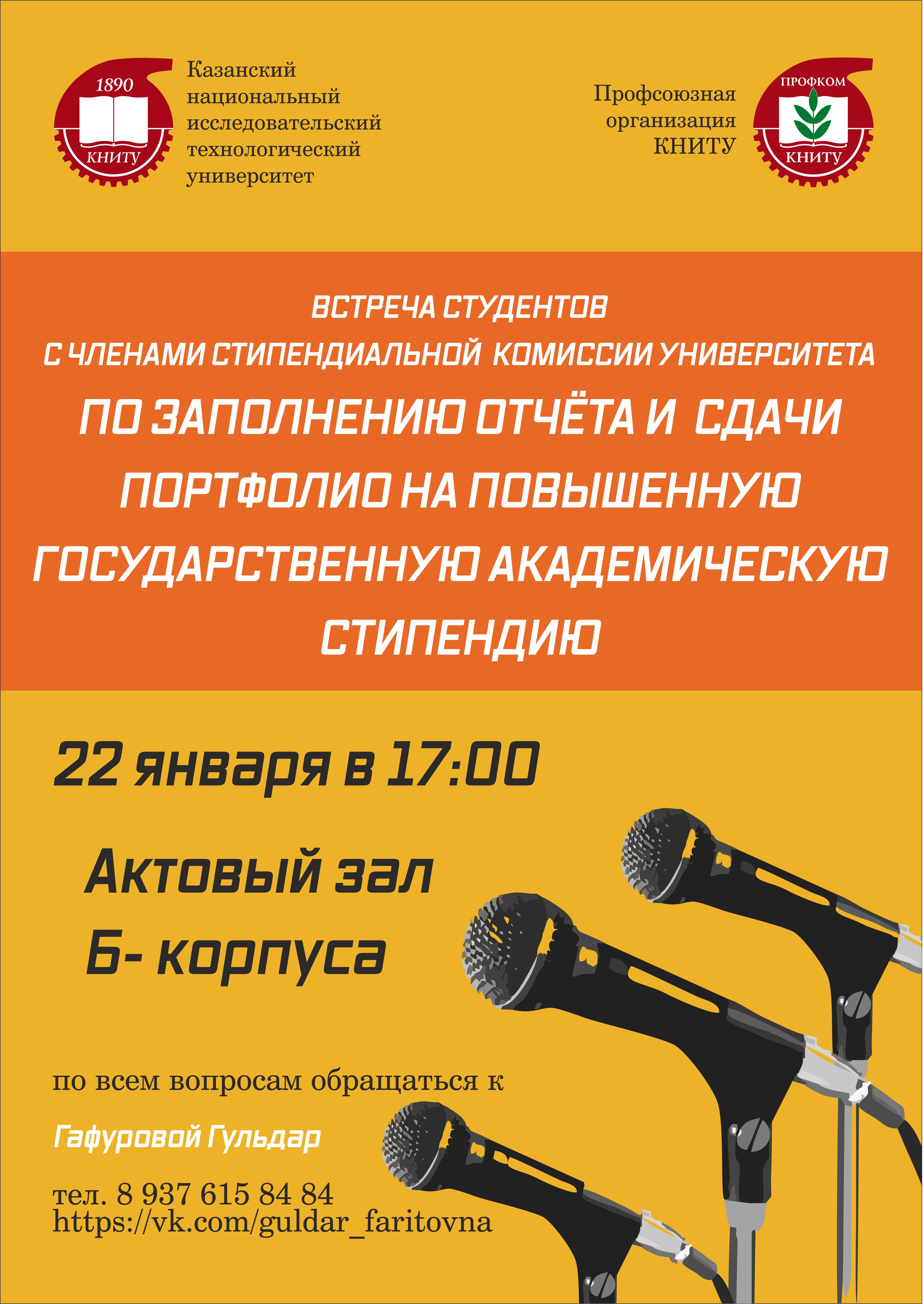 18.01.2018 22 января 2018 года в Актовом зале корпуса "Б" КНИТУ в 17.00 состоится встреча студентов с членами стипендиальной комиссии университета по заполнению отчета и портфолио, согласно критериям, для подачи на повышенную государственную академическую стипендию (ПГАС). Желающим необходимо зарегистрироваться по ссылке С 15.01.2018 до 05.02.2018 – срок подачи документов на повышенную государственную академическую стипендию (ПГАС) для студентов, у которых промежуточная аттестация заканчивается в январе. По всем возникшим вопросами вы можете обратиться к председателю профбюро своего факультета, а также к председателю учебно-правовой комиссии (УПК) студенческой секции профкома КНИТУ - Гафуровой Гульдар, тел. 89376158484. Приложение: