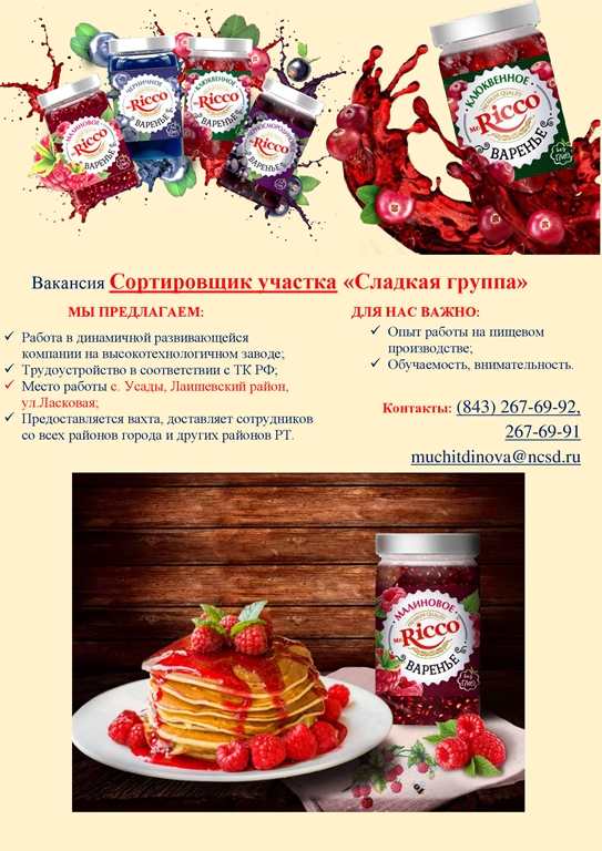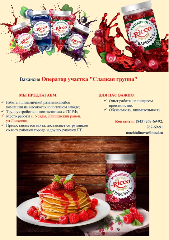 10.05.2018 Вакансии: начальник оборудования, сортировщик и оператор участка "сладкая жизнь"