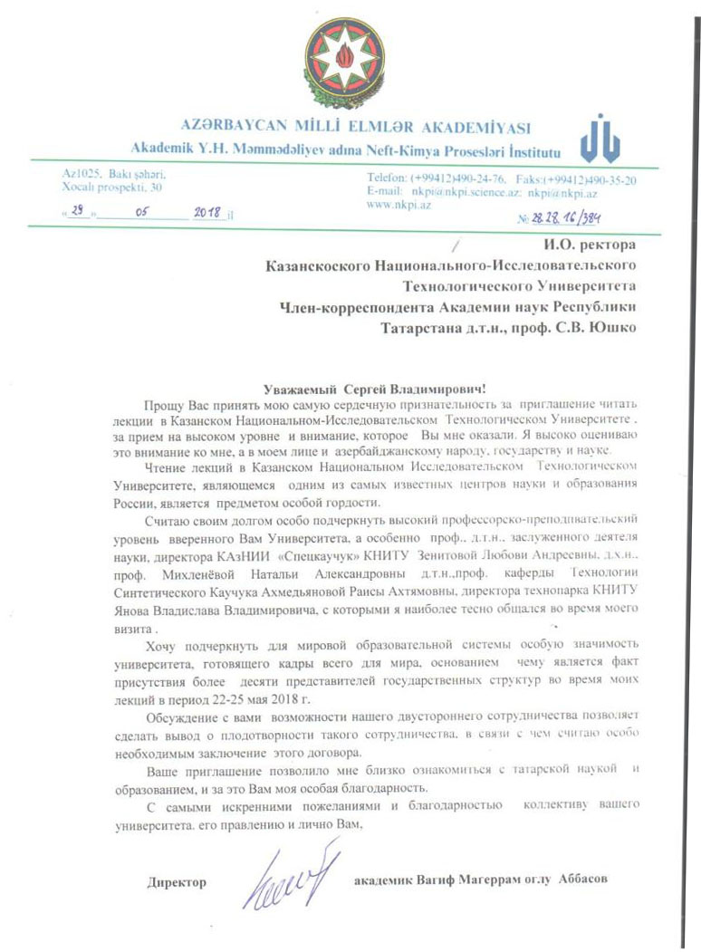 31.05.2018 С 22 по 25 мая 2018 г. в КНИТУ был проведен курс лекций по образовательной программе «Перспективные процессы нефтегазохимии». С лекциями выступил известный ученый, директор Института нефтехимических процессов Национальной Академии наук Азербайджана - академик Вагиф Аббасов. Визит Вагифа Аббасова состоялся в рамках выигранного КНИТУ гранта Правительства Республики Татарстан «Алгарыш» на подготовку, переподготовку и стажировку граждан в российских и зарубежных образовательных и научных организациях. Область научных интересов академика Вагифа Аббасова: азербайджанские нефти, их свойства, структурно-групповой состав и направления использования; проблемы коррозии и обессоливания нефтей в современной нефтегазодобывающей промышленности; технологии получения реагентов для повышения нефтеотдачи и возможности их использования в промышленности. В рамках встреч руководства и ученых КНИТУ с академиком Вагифом Аббасовым, обсуждались вопросы продолжения и развития взаимного сотрудничества. Также, Вагиф Аббасов провел ряд встреч, в том числе с Президентом Академии наук Республики Татарстан - Салаховым Мякзюмом Халимуловичем, Генеральным директором ОАО "Татнефтехиминвест-холдинг" - Яруллиным Рафинатом Саматовичем, Директором Института органической и физической химии им. А.Е.Арбузова Казанского научного центра РАН, председателем Казанского научного центра РАН - Синяшиным Олегом Герольдовичем, а также посетил технопарк Идея и Технополис Химград. Приложение: Письмо академика Вагифа Аббасова, 153.0 КБ