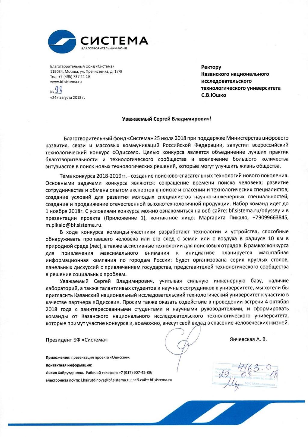 31.08.2018 Благотворительный фонд «Система» приглашает талантливых студентов и научных сотрудников КНИТУ к участию во Всеросийском технологическом конкурсе «Одиссея». Тема конкурса 2018-2019 на создание поисково-спасательных технологий нового поколения. Цель проведения Конкурса: содействие деятельности в сфере науки путем поддержки и популяризации проектной деятельности, направленной на решение социальных проблем, среди специалистов технической сферы, в том числе молодежи и студентов, а также содействие добровольческой (волонтерской) деятельности по поиску пропавших людей путем способствования созданию инновационных технологических решений и их внедрению в свободное массовое производство и использование на территории Российской Федерации. Задача Конкурса: создание устройства (Технологического решения), способного обнаружить пропавшего живого человека без источника радиосигнала с земли или с воздуха в радиусе не менее 10 (десяти) километров в природной среде (лес) в течение не более 10 (десяти) часов с момента начала поиска вне зависимости от времени суток и погодных условий. Более подробная информация о Конкурсе на сайте. Контактная информация: Лилия Хайрутдинова. Т. +7(917)907-42-89; Приложение: Положение о конкурсе, 283.2 КБ
