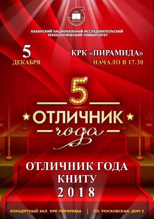01.12.2018 5 декабря в КРК "Пирамида" в 17 30 состоится церемония вручения премии «Отличник года-2018» КНИТУ. Стань свидетелем самого главного события года Технологического! 5 декабря состоится Ежегодная премия «Отличник года КНИТУ 2018». Коктейльные платья и смокинги, светские беседы, интервью для телевидения и вспышки фотокамер – все это окружит тебя в этот вечер. Будут выбраны лучшие из лучших в 14 номинациях. Кто же получит заветную «пятёрку»? Грандиозное шоу состоится: 5 декабря в 17:30 в концертном зале КРК «Пирамида» (г. Казань, ул. Московская, 3). Номинанты премии «Отличник года 2018»