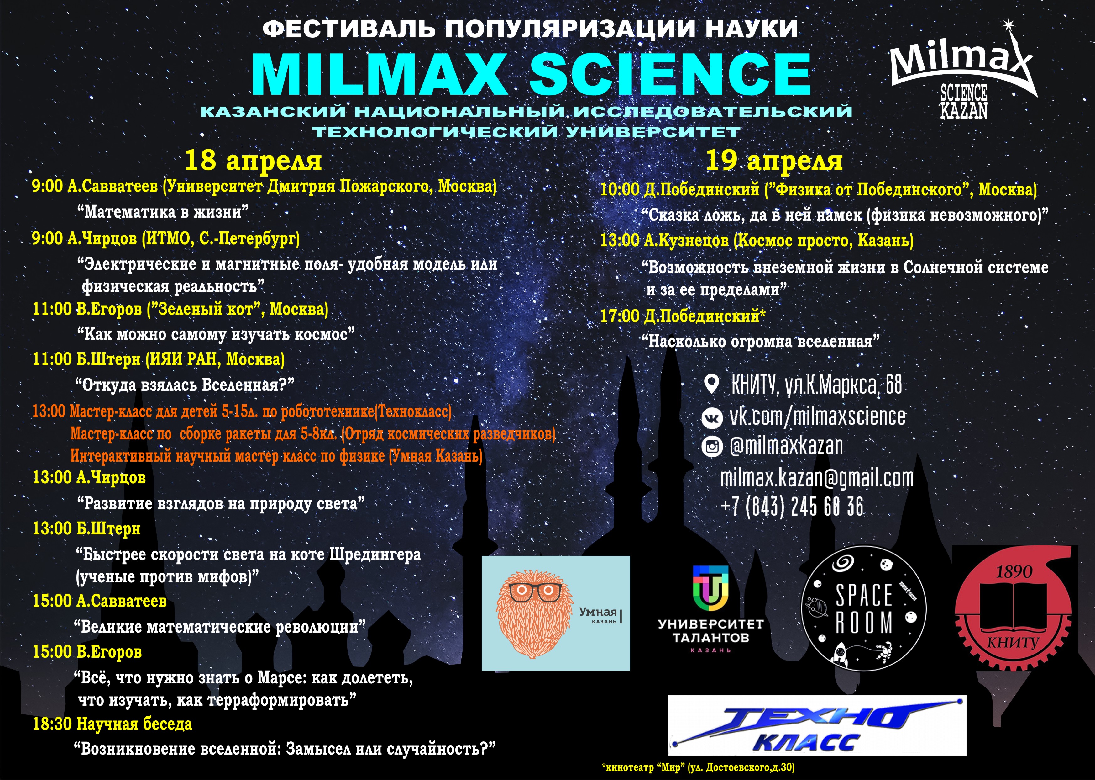 В рамках фестиваля в аудиториях КНИТУ с публичными научно-популярными лекциями выступят Савватеев А.В. (математика, университет им. Дм.Пожарского, г. Москва), Дмитрий Побединский (автор канала «Физика от Побединского»), Чирцов А.С. (физика, ИТМО С.-Петербург), Виталий Егоров (астрономия, космонавтика) и другие известные деятели популяризации науки.