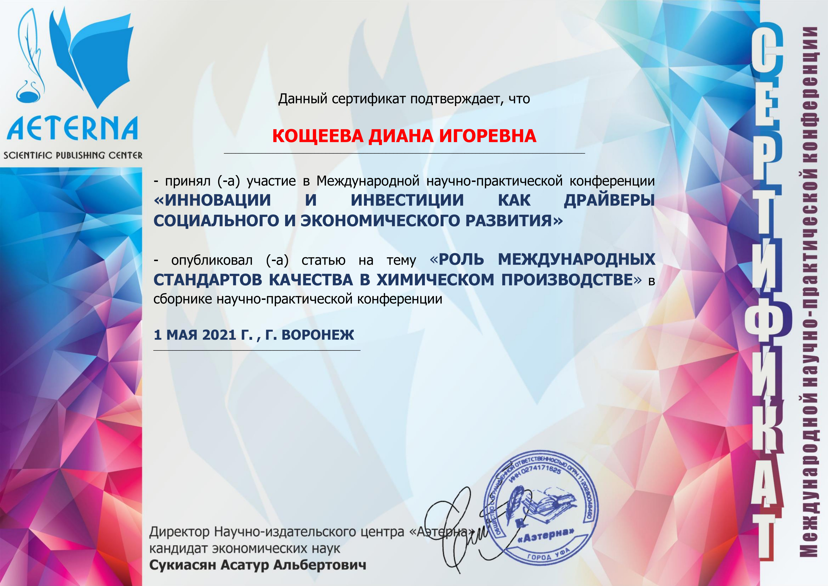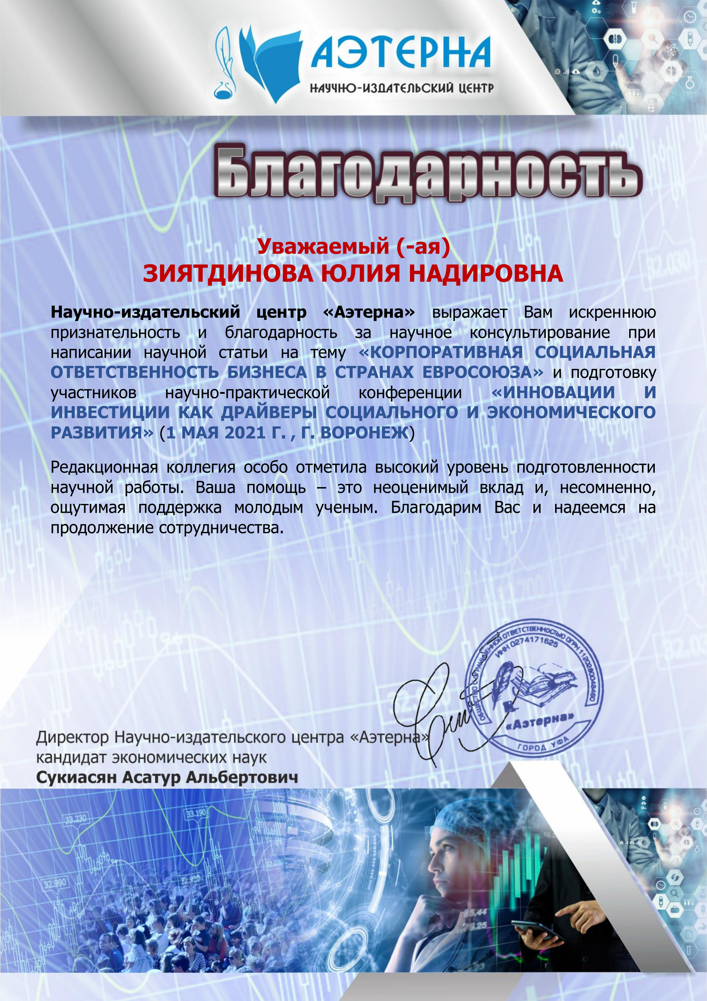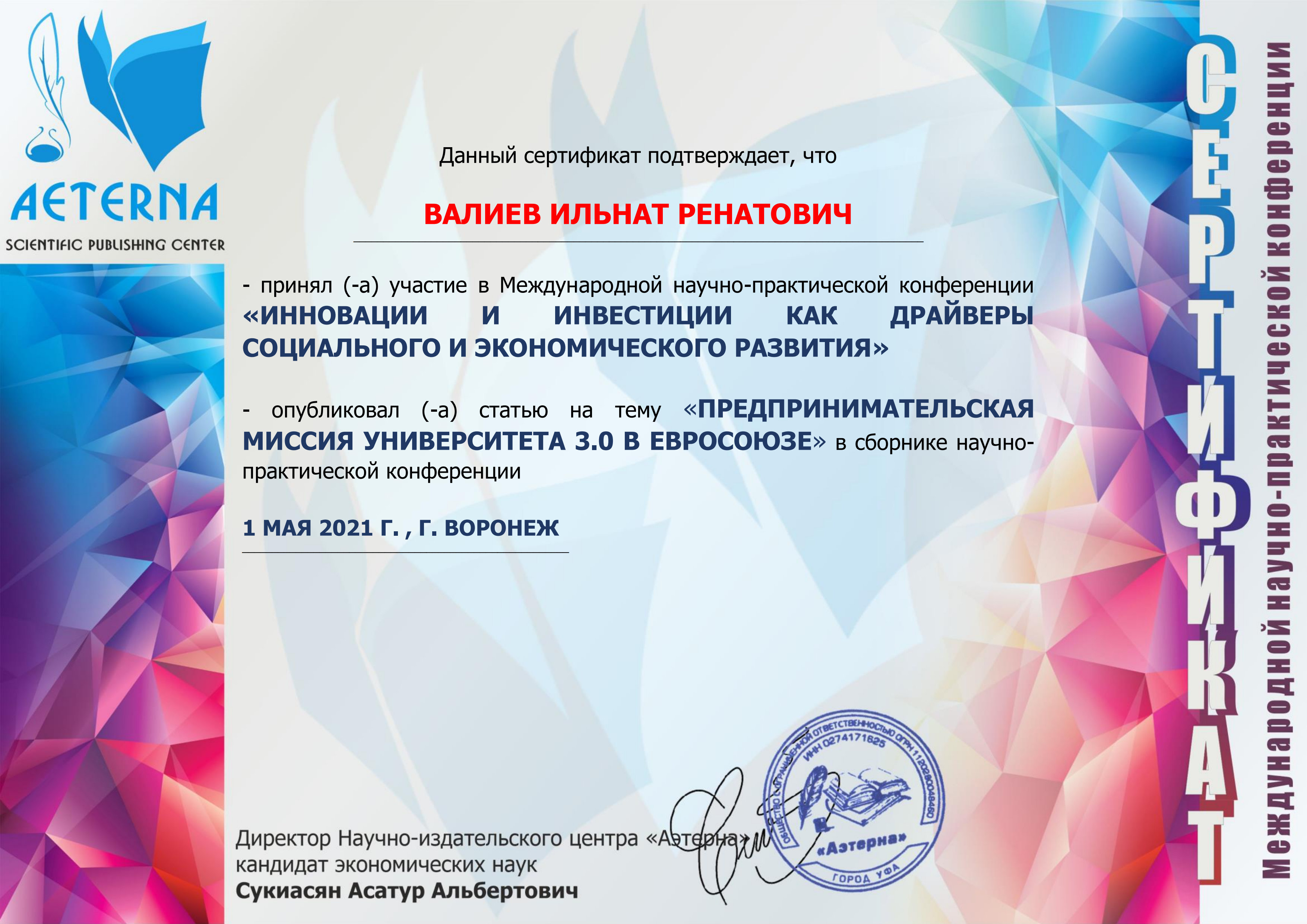 11.05.2021 On May 1, 2021, three graduate students of the engineering MSc degree program in Innovation (Project Management) from the Department of Innovation in Chemical Technology participated in the international research to practice conference “Innovations and Investments as Drivers of Social and Economic Development”. The conference was held in the city of Voronezh under support of the research and publishing center Aeterna. The conference web-page is https://aeterna-ufa.ru/events/nk-ec-142/ The students will graduate this year, and the topics of their reports were related to their graduate Master’s thesis and experiences of the European Union in this field which they studied in the Jean Monnet Module “The European Union Entrepreneurial Environment at HEIs: Changing the World by Technology Ventures” courses during their first year in the Master’s degree program. Due to the COVID-19 limitations, the conference was held online, and gathered 19 students from Russia, Kazakhstan, Armenia, Uzbekistan, China and Mongolia. Ilnat Valiev gave a report titled “Entrepreneurial University 3.0 in European Union” analyzing the new role of the universities in the economy of knowledge where they have to focus on entrepreneurship apart from teaching and research. His research was supervised by Dr. Artem Bezrukov. Diana Kosheeva gave a report together with her research supervisor Dr. Anna Starodubova titled “Role of International Quality Standards in Chemical Production”. The report covered the issues of individual ISO certificates in the EU countries ranking the countries according to the number of ISO certificates received. Rifkat Sultanov’s report was titled “Corporate Social Responsibility of Business in Countries of European Union”. The research was supervised by Dr. Julia Ziyatdinova and focused on the issues of intercultural communication in corporate social responsibility for building cooperation between the EU countries and Russia. The reports received an overall positive feedback from other conference participants. The students received certificates of participation in the conference, and their research supervisors received recognition letters. The reports were published as papers in conference proceedings.