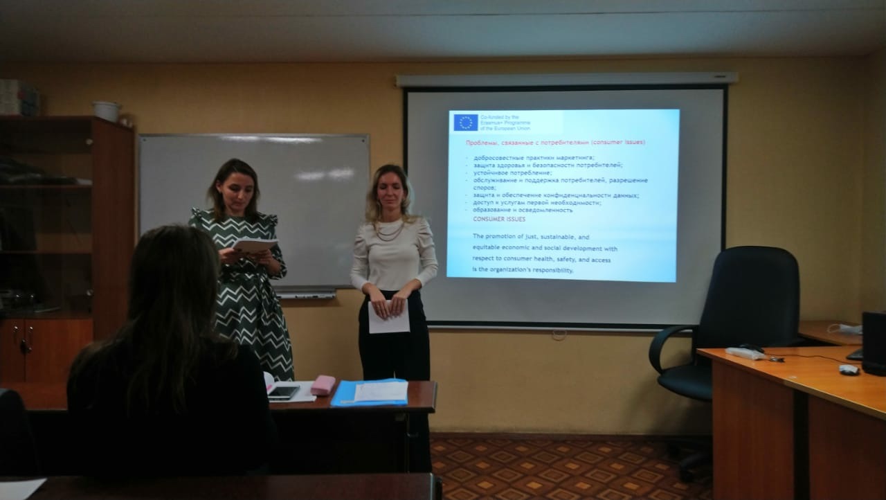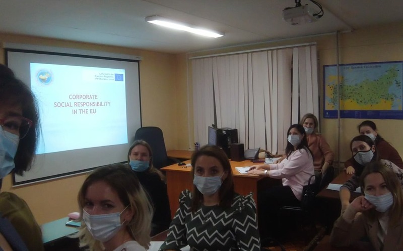In 2021-22 academic year, during the classes in “EU Entrepreneurship Values: Cultural Diversity and Unity”, Julia Ziyatdinova, the Chair for Department of Foreign Languages for Professional Communication, runs discussions with students on the topics of corporate social responsibility in EU countries. The students learned the basic information about the ISO 26000 International Standard on Social Responsibility (CSR). After that, in teams, students learned the details of such core subjects in CSR, as organizational governance, human rights, labour practices, the environment, and consumer issues. Each of the teams presented the results of their investigations to the group.