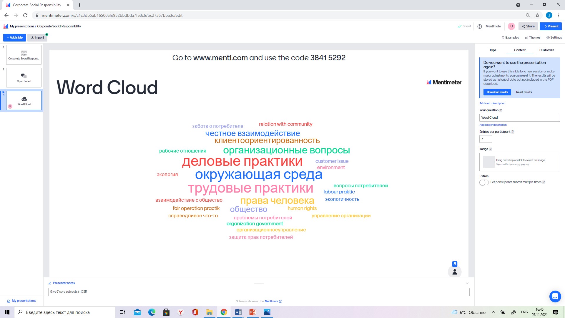 At the end of the class, using the interactive online instrument Mentimeter.com, the students composed a cloud of meanings for the term of corporate social responsibility.