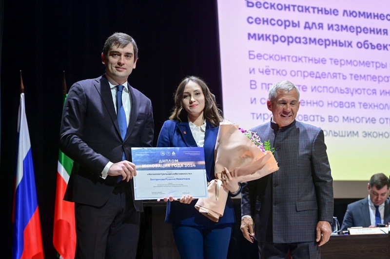 28.02.2025 The awards ceremony for the winners of the republican competition “Innovation of the Year” in the categories “Intellectual Property” and “Corporate Innovations” took place on February 21st at the Volga Region University. Among the winners was Ruzanna Ziyatdinova , Candidate of Chemical Sciences, Assistant of the Department of Physical and Colloid Chemistry of KNRTU. The award was presented to her by Maxim Kolesnikov , First Deputy Minister of Economic Development of the Russian Federation, and Rustam Minnikhanov , Rais (Head) of the Republic of Tatarstan. The main goals of the competition were the implementation of innovative technologies in the Republic’s economy, development of knowledge-intensive production, and enhancement of competitiveness of technological companies. This year, the competition experts focused their attention on ready-made solutions such as prototypes and projects with business potential. The accent was placed on applied developments, which allowed to improve quality of applications and select the most promising initiatives. The competition attracted a total of 514 applications, and was organized by the Investment and Venture Fund of the Republic of Tatarstan, the Ministry of Education and Science of the Republic of Tatarstan and the Academy of Sciences of the Republic of Tatarstan. The subject of Ruzanna Ziyatdinova work was “Non-contact luminescent sensors for measuring temperature of micro-sized objects”. Unique projects, technologies and patent were evaluated in the nomination “Intellectual Property”. “Under the guidance of Prof. Yuri G. Galyametdinov , we are developing remote luminescent temperature sensors based on lanthanide compounds – chemical elements with effective luminescence. Such thermometers have a unique advantage - the possibility of non-contact measurement and large-scale visualization of micro-objects such as microelectronics and biomedicine. Unlike similar compounds, our proposed compounds are able to form homogeneous films in the absence of crystallization. They are easy to use, inexpensive, do not require additional graduation, and demonstrate high stability of measurements. At the same time, we can measure the surface temperature with high sensitivity and in a wide temperature range, which exceeds the performance of similar products in the world,” said Ruzanna. According to the project author, the development can be applied in many sectors of the national economy. Thanks to contactless operation, the sensors can measure temperature where it was difficult to do so before. Due to their unique properties, such sensors can be used at enterprises to control chemical processes and operation of various units.