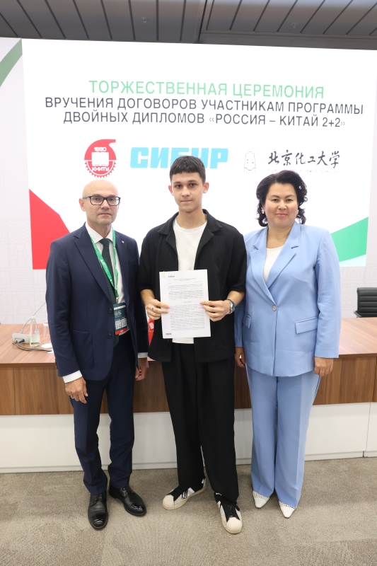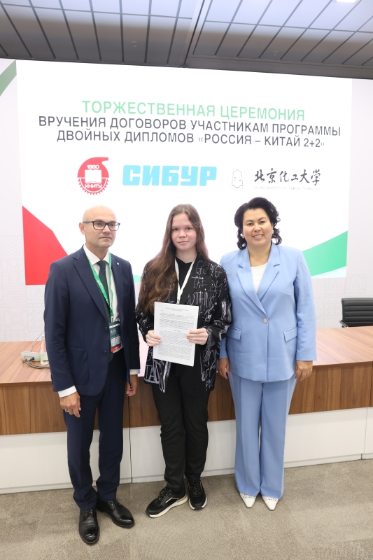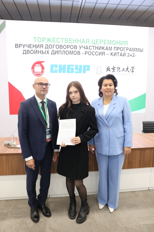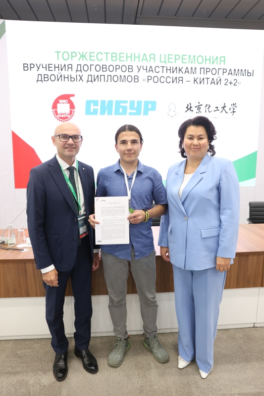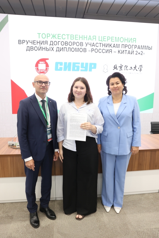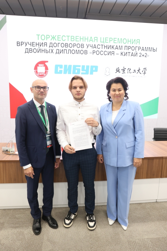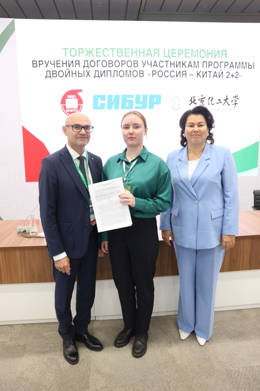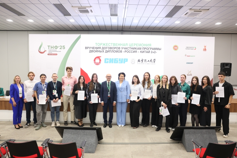 29.08.2025 On August 27, as part of the Tatarstan Petrochemical Forum, a solemn ceremony was held to award contracts to students participating in the KNRTU—BUCT 2+2 double degree program, which Kazan National Research Technological University is implementing with the support of SIBUR and the Beijing University of Chemical Technology. In the presence of the university's industrial partners, 14 students received signed trilateral agreements from KNRTU Rector Yuri Kazakov and Vice Rector for Academic Affairs Dilbar Sultanova. This event is particularly relevant in the light of the working visit to China of the Minister of Science and Higher Education of Russia Valery Falkov, which took place these days, dedicated to the development of scientific and educational cooperation between the two countries. Valery Falkov remarked that the development of closer partnership in the field of higher education was one of the objectives of the visit. "There are very good relations between ministries, universities, scientific organizations, collectives, and, finally, between specific scientists and teachers today. Figuratively speaking, we are currently working on all floors of this large building, strengthening or establishing contacts" (TASS). A vivid proof of the development of direct cooperation between universities in our countries is the dual degree program, which KNRTU, together with the Beijing University of Chemical Technology (BUCT), has been implementing since 2022. The program participants are students of the Institute of Polymers and the Institute of Chemical and Petroleum Engineering of KNRTU. In June 2025, the first graduates of the program (14 people) returned from China, who will be employed at SIBUR enterprises. "I consider the double degree program with BUCT to be an excellent opportunity for us, students, to expand our horizons and gain unique international experience," says one of the participants of the program, Alina Tukhfatullina. In addition to strengthening international cooperation between universities and improving the quality of education, one of the goals of the BUCT program is to meet the staffing needs of industrial partners. For example, SIBUR pays for language training for our students, scholarships during their studies in China, flights between Kazan and Beijing, visa support, and after completing the program, it provides graduates with career paths at its enterprises. In addition to the double degree program, KNRTU students can participate in other academic mobility programs in China. For the second year now, our students have been attending the International Science and Technology Innovation Camp at BUCT. In addition, our students are actively applying for master's and postgraduate studies at leading universities in China.