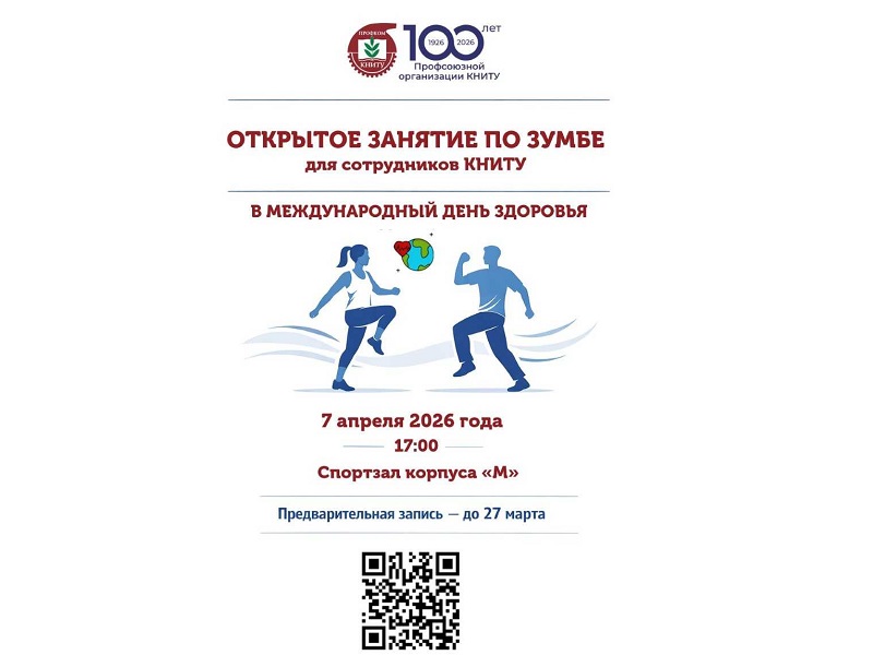 23.03.2026 Уважаемые коллеги! Профком КНИТУ приглашает членов профсоюза отметить Всемирный день здоровья с пользой для здоровья, активно и вместе! В рамках юбилейных мероприятий, посвящённых 100-летию профсоюзной организации Казанского национального исследовательского технологического университета, с целью популяризации здорового образа жизни, Профком КНИТУ организует для работников университета – членов профсоюза открытое занятие по зумбе. Спортивно-массовое мероприятие «Зумба-урок» (танцевальная фитнес-тренировка), приуроченная к Всемирному дню здоровья, состоится 7 апреля 2026 года в спортивном зале корпуса «М» КНИТУ, начало – в 17.00. Зумба – это танцевальная фитнес-программа, сочетающая элементы аэробики и танцев, способствующая повышению двигательной активности, снятию эмоционального напряжения и поддержанию хорошего самочувствия. Это кардиотренировка, направленная на эффективное сжигание калорий и укрепление сердца. Зумба-фитнес развивает гибкость, пластику, выносливость, координацию, укрепляет здоровье и поднимает настроение. Зумба – это отличная эмоциональная разгрузка! Занятие пройдёт под руководством профессионального инструктора. Специальная подготовка для участия не требуется. Для членов профсоюза участие бесплатное. Присоединяйтесь! Откройте для себя во Всемирный день здоровья Зумбу – фитнес увлекательный и доступный через танцы под латиноамериканские ритмы. Для участия просим пройти предварительную запись по ссылке: forms.office.com Совет: для занятия по зумбе выбирайте удобную спортивную форму и кроссовки.