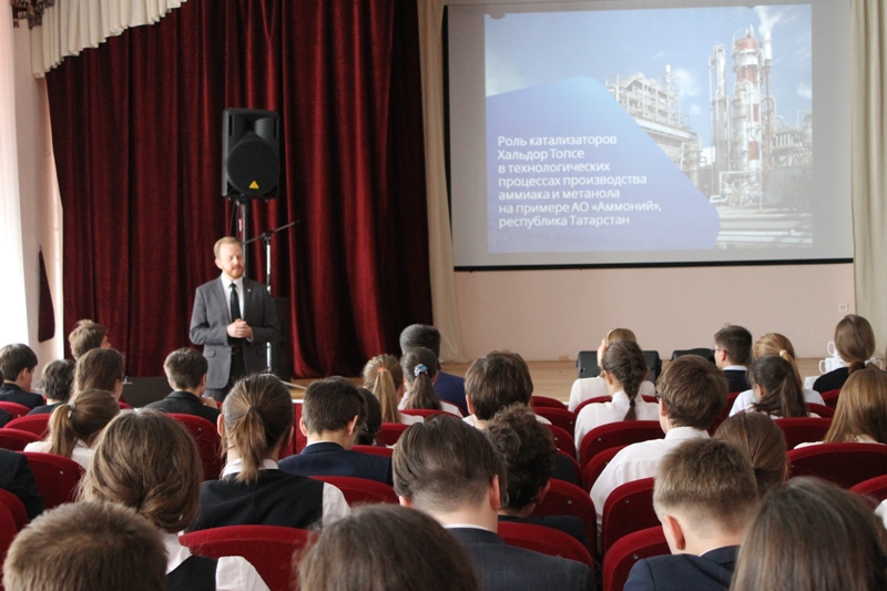 22.05.2017 18 мая в лицее-интернате для одаренных детей с углубленным изучением химии КНИТУ состоялась лекция представителя компании «Хальдор Топсе». Андрей Чемагин, как опытный инженер, в деталях ознакомил ребят с производством катализаторов, процессами, которые протекают при этом, с географией компании и ее деятельностью в целом, а также с химическим заводом «Аммоний». Датская компания «Хальдор Топсе» – мировой лидер в области катализа и изучения физико-химических свойств поверхности, эксперт в создании энергоэффективных технологических решений. Компания, являясь полностью частной, сегодня имеет свои представительства в 11 странах на пяти континентах, в том числе в столице России. В ходе неформального общения Андрей Чемагин ответил на множество вопросов, которые возникали у лицеистов в процессе лекции. В завершение мероприятия состоялось торжественное награждение победителя олимпиады «Хальдор Топсе» Дарьи Ермаковой, которая в этом году поедет на стажировку в Данию. Также все ребята профильного класса «Хальдор Топсе» получили памятные сувениры.